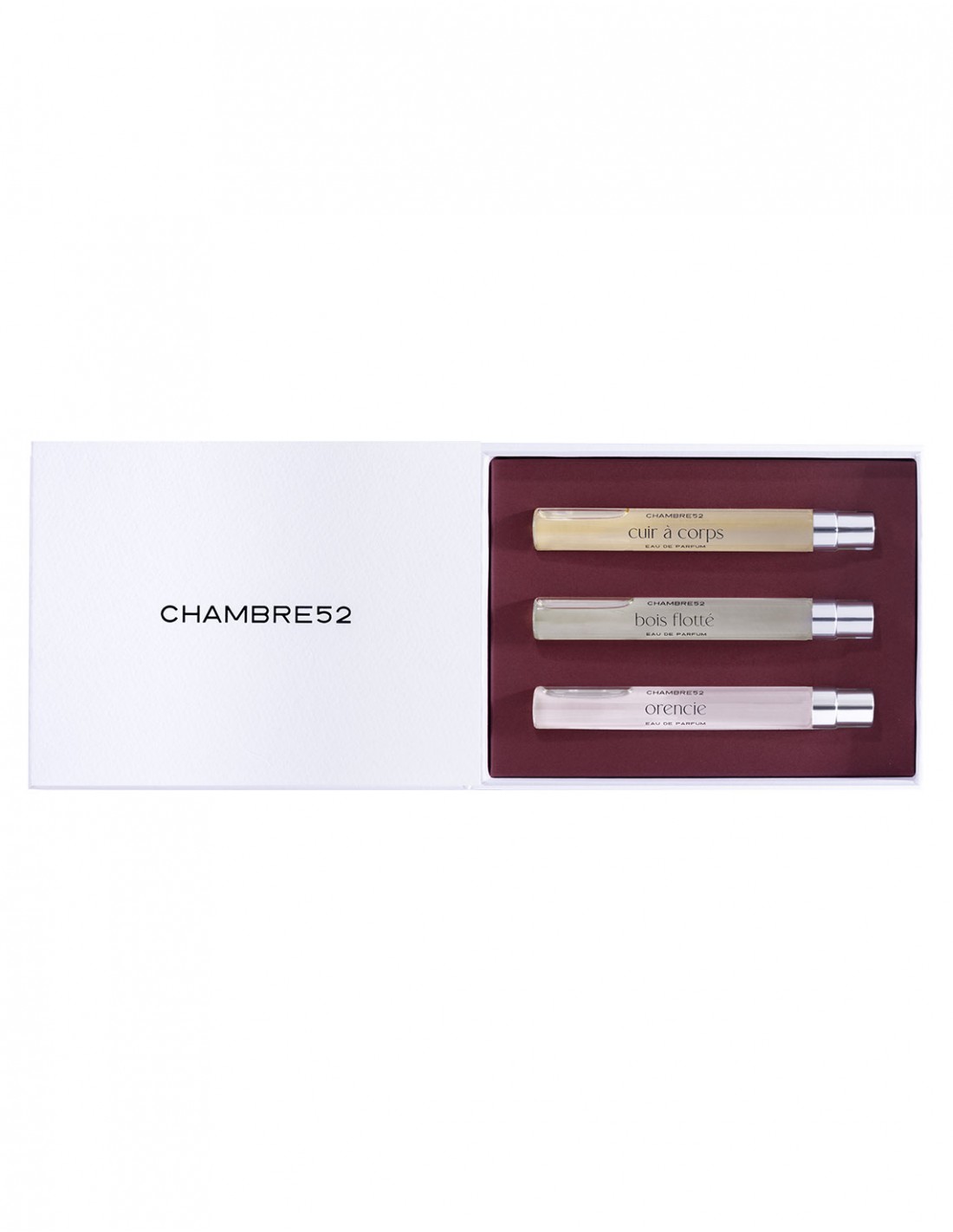 This travel set contains three 10 ml bottles of CHAMBRE52's signature fragrances: ORENCIE, CUIR A CORPS, BOIS FLOTTE.